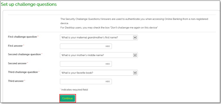 Step 5: Set Up your Challenge Questions. Click “Continue”.